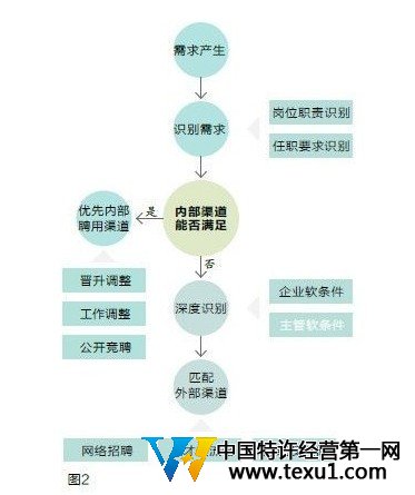 招聘渠道主要分為兩種(圖2):一種是內(nèi)部聘用,包括晉升選拔、工作輪換、工作調(diào)動、內(nèi)部公開競聘等。另一種是外部聘用,包括公司員工推薦、校園招聘、網(wǎng)絡(luò)廣告招聘、人才交流會、獵頭公司代理、公司間交換等。