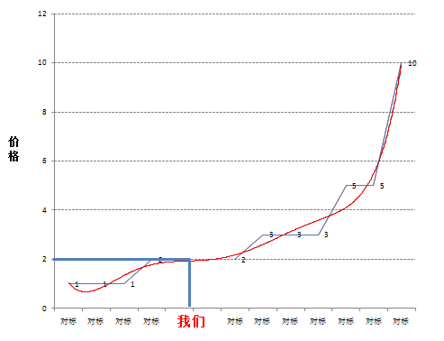 這個(gè)的意思是市面上有很多競爭者,他們的價(jià)格大小非常不同。我們把競爭對手們的價(jià)格從低到高地排列出來,或者畫成價(jià)格分布曲線。
