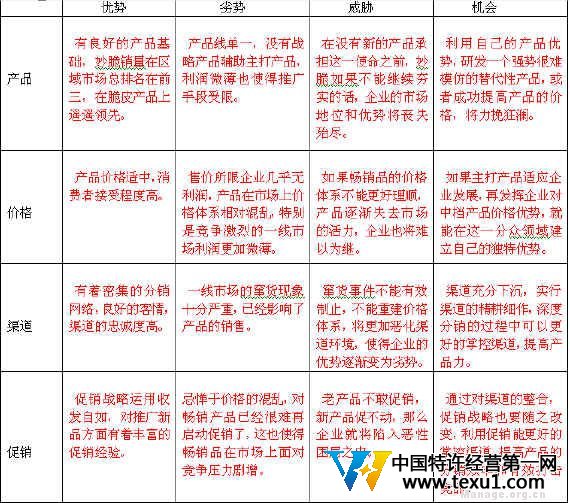 我們的主打產品由于多年暢銷東北區域市場,在分眾脆皮市場占有著高達50%的市場份額,因此也衍生了大量的渠道問題,包括經銷商利潤微薄,促銷戰略難以開展和執行,產品更新上畏首畏尾,渠道管控上也缺乏力度,特別是三四線市場上更有鞭長莫及的慨嘆。下面是我們所做的妙脆swot分析: