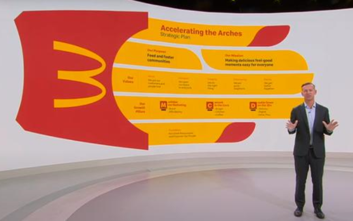 比如,麥當勞2019年新上任的CEO即Chris Kempczinski在履新一周年之際,宣布麥當勞正從上一個“光速增長計劃”過渡到“Accelerating the Arches”這一新的增長戰略,新戰略下的三大增長支柱增長支柱即所謂的MCD計劃。