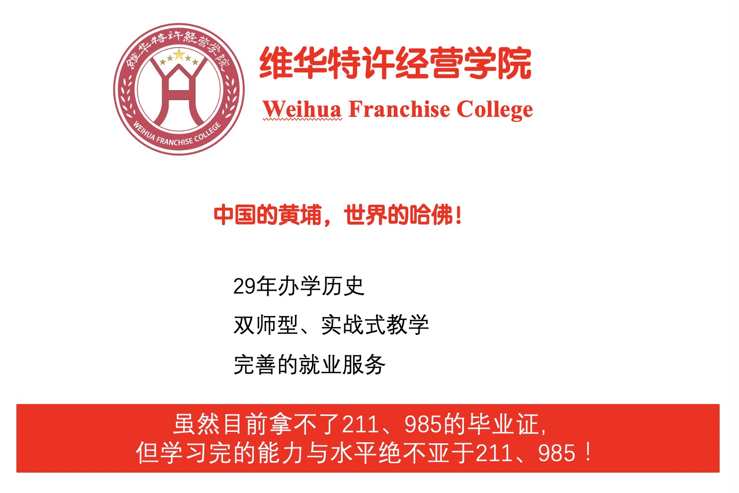 所以,正是在這樣的信念催動之下,“維華特許經營學院”才應運而生,我們嚴格地按照不亞于一流大學的課程、師資、教材尤其是那份對孩子的愛與責任去設計、實施!我們的口號和辦學宗旨就是:拿不到211、985的畢業證,就拿211、985的水平和能力!