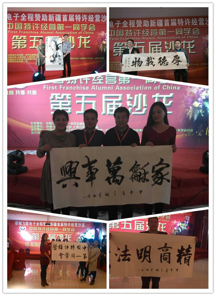 中國特許經營第一同學會河南分會程晏萍會長攜著名畫家田禾參加了此次沙龍活動。在沙龍活動現場,更是現場作畫,送給中國特許經營第一同學會一幅大吉圖,預祝同學會大吉大利,發展勢如破竹,能夠幫助更多的企業家插上夢想的翅膀!送給新疆分會一副“三羊開泰”,預祝新疆分會好運連連,三陽開泰!更是在現場免費為與會的企業家朋友們作畫,寫字,受到了企業家朋友們的熱烈鼓掌!