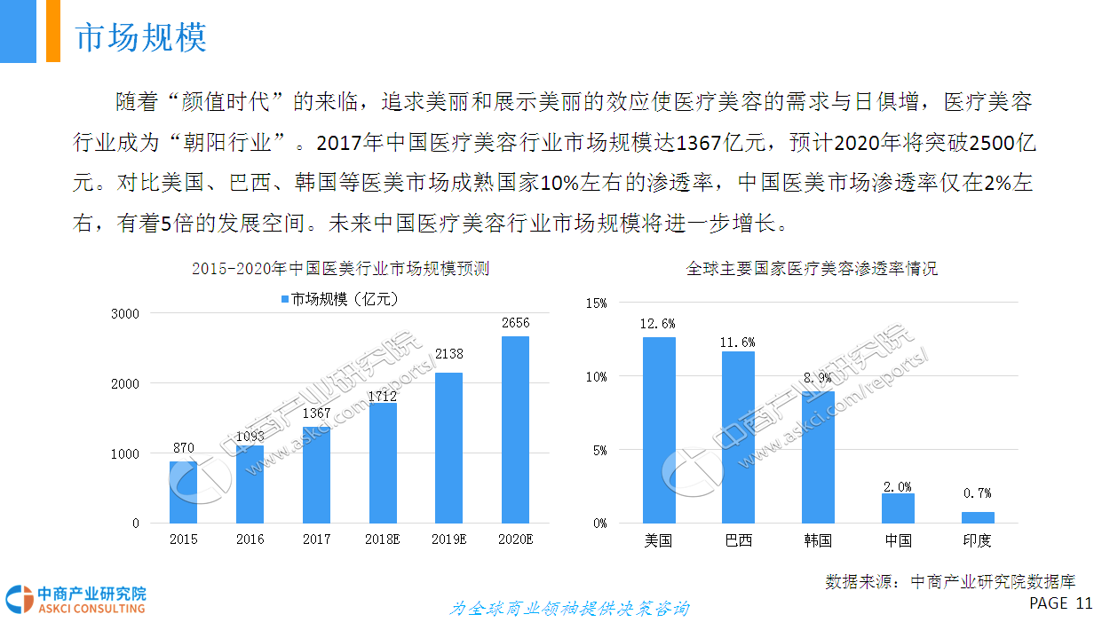 隨著“顏值時代”的來臨,追求美麗和展示美麗的效應(yīng)使醫(yī)療美容的需求與日俱增,醫(yī)療美容行業(yè)成為“朝陽行業(yè)”。2017年中國醫(yī)療美容行業(yè)市場規(guī)模達(dá)1367億元,預(yù)計2020年將突破2500億元。中國醫(yī)美市場滲透率僅在2%左右,與醫(yī)美成熟國家相比,增長空間較大。