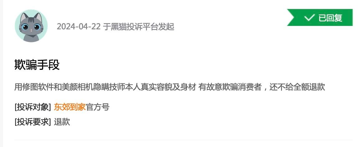 在黑貓投訴平臺(tái)上,技師容貌是東郊到家投訴的重點(diǎn)。有用戶投訴技師“用修圖軟件和美顏相機(jī)隱瞞技師本人容貌和身材”。