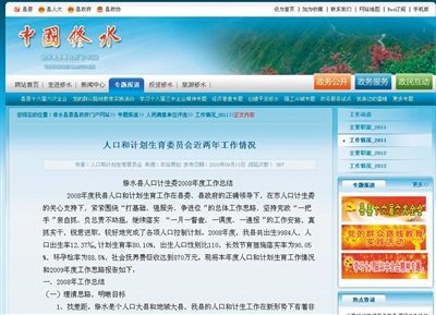 修水縣委縣政府網站上刊登的該縣近年計生工作報告。網站截圖