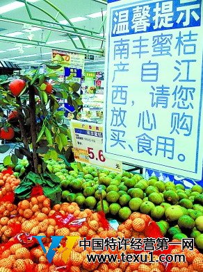 2008年10月22日,在北京新發地市場,一排排裝滿橘子的貨車整齊地排列著,即使賤賣也少有買主。圖為北京京超市掛牌明示產地(資料圖片)