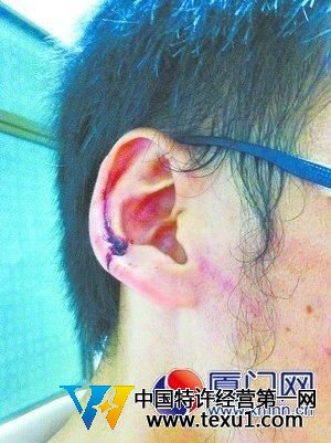 除了敲腦袋,這個教練對沈先生的耳朵也“特別關照”。沈先生向記者出示了幾張照片,照片上右耳廓中間有凝結的血塊,靠近耳根的臉頰上也有一道紅色的挫傷印痕。