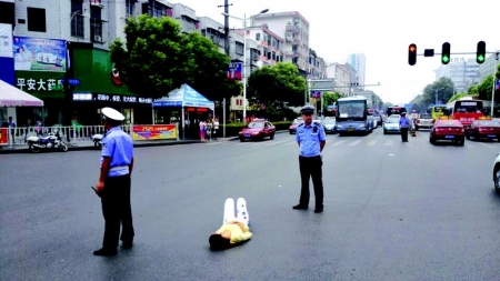 22日下午3時許,在北京路江漢路口,一名年輕女孩突然闖到了馬路上,橫臥路口中央,十分危險,過往車輛紛紛避讓。市公安交管局二大隊六中隊執勤民警見狀,立即上前為該女孩組成人墻,防止其遭碾傷。