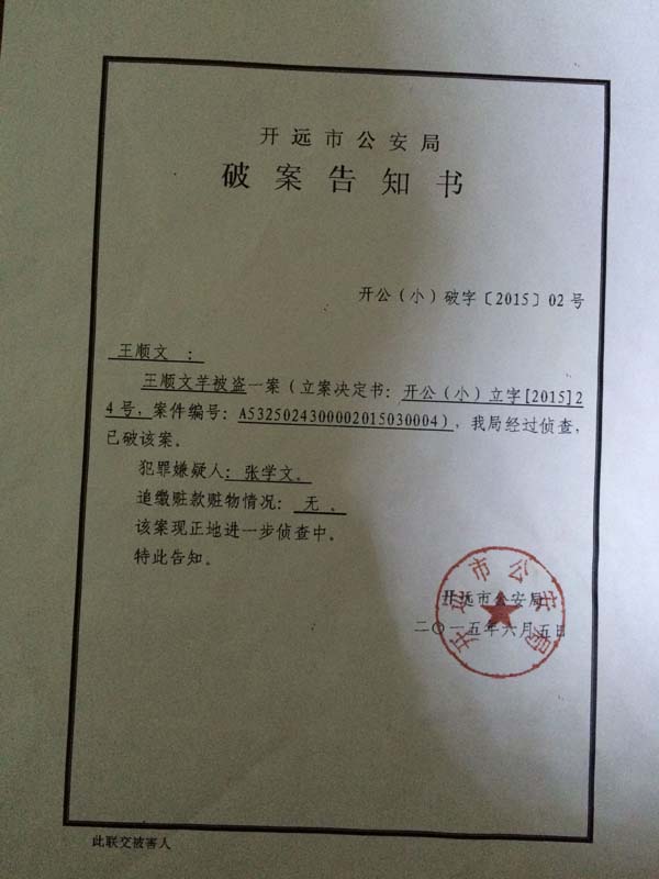 開(kāi)遠(yuǎn)市公安局給王順文的破案告知書(shū)。