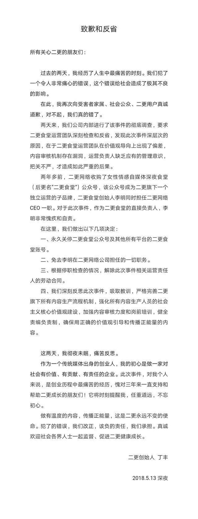 5月13日,二更創始人丁豐在朋友圈就11日“二更食堂”發布的關于“滴滴司機殺害空姐”一案的不當推文事件進行了回應。丁豐表示零容忍,二更主動永久關停二更食堂并深夜再次致歉。同時,二更食堂創始人李明被免去二更網絡公司擔任的一切職務。