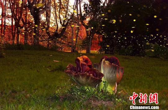 圖為月色下的疣柄磨芋和螢火蟲。 朱仁斌 攝