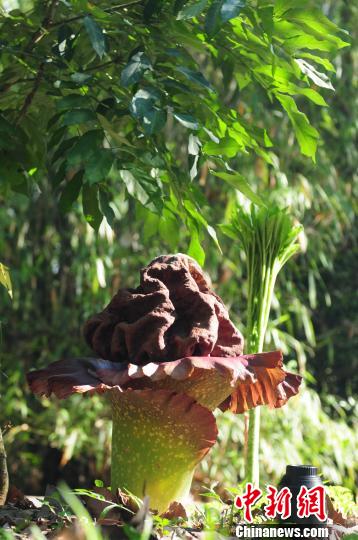 中新網昆明5月18日電 (楊振 吳珊 李璐)記者18日從中國科學院西雙版納熱帶植物園(下稱“版納植物園”)獲悉,近日該園70余株“尸花”——疣柄魔芋進入盛放期,吸引眾多游客“聞臭”。