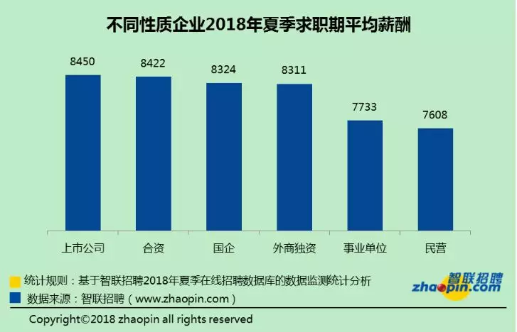 事業單位和民營企業的薪酬水平排名沒有變化,事業單位以7733元排名第五,民營企業以7608元排名最末。合資和民營企業的薪酬水平環比漲幅最大,而國企和事業單位的平均薪資較去年同期漲幅較大。