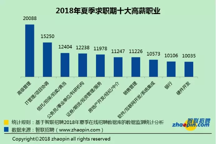 從不同職業的薪酬水平來看,高級管理繼續蟬聯十大高薪職業榜首,以20088元的高薪繼續領跑其他職業。
