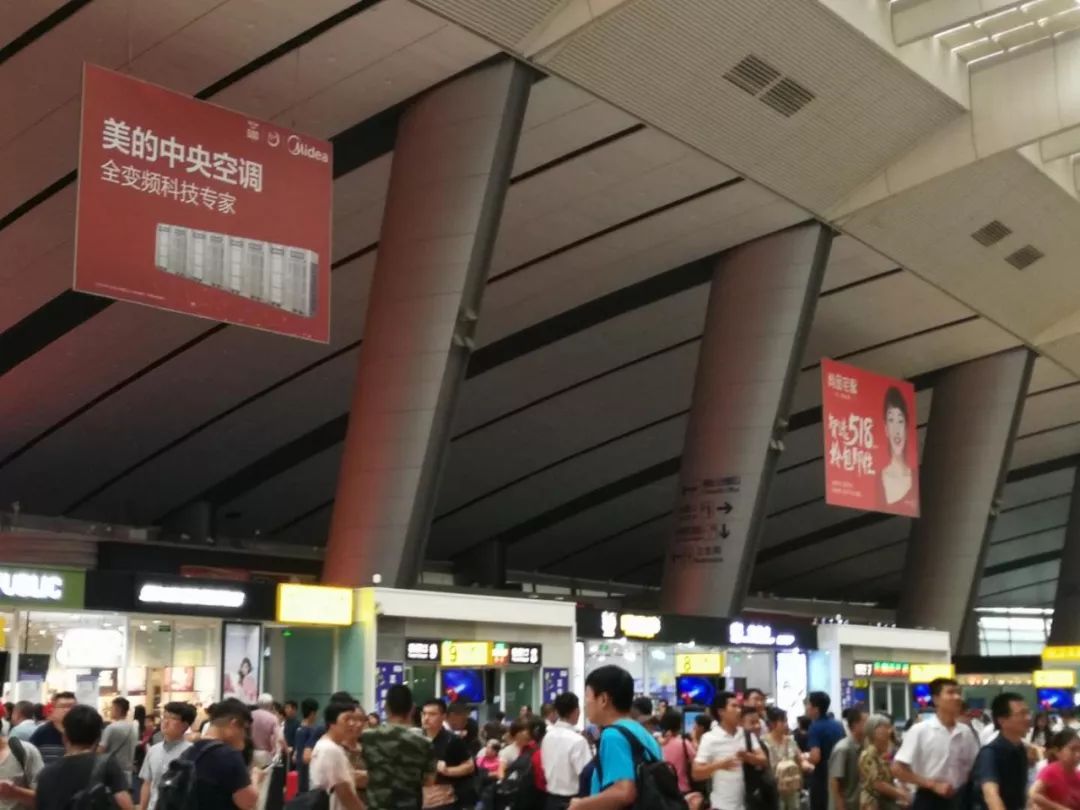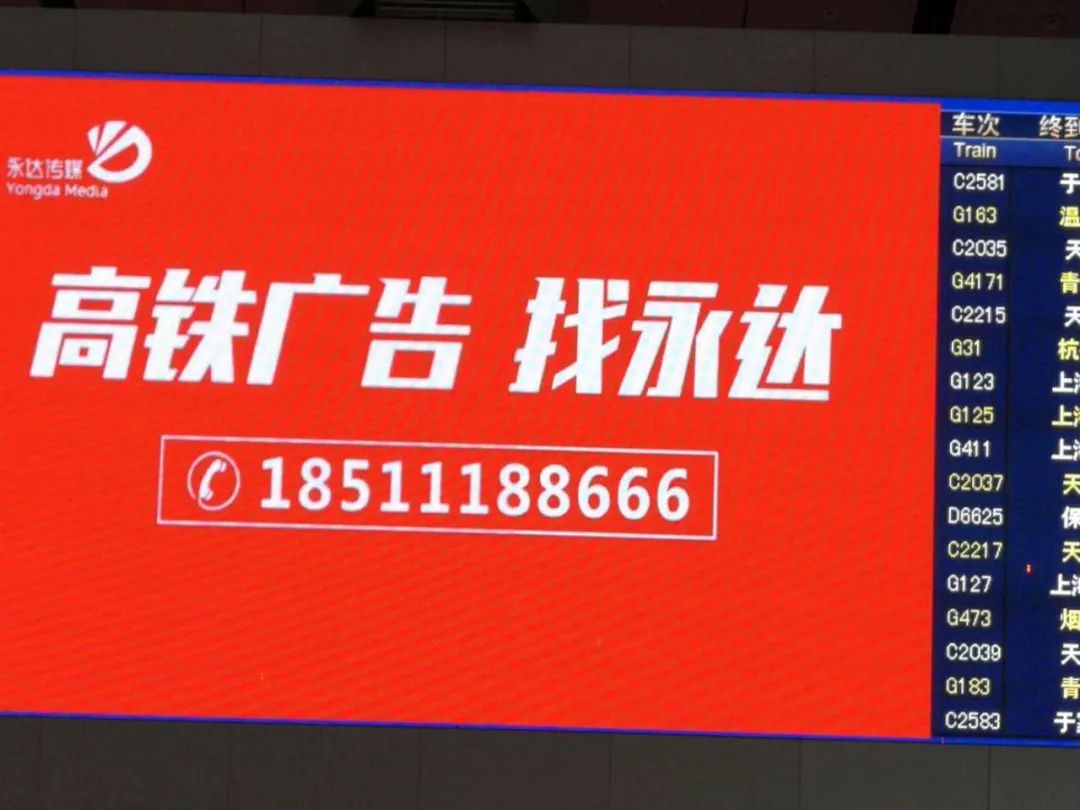 (附圖:北京南站大屏上的車次公告和中間的廣告)