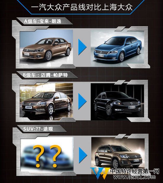 一汽大眾旗下產品線覆蓋A0-B級車,所推出的車型均屬于轎車。在SUV領域目前上述空白,產品線相對匱乏已成為一汽大眾面臨問題之一,胡詠在接受采訪時表示:“從未來的方向來講,一汽-大眾會進入更新的細分市場,這其中就包括SUV領域。”相比而言,上海大眾在所推出的途觀后,無論在品牌營銷與銷量上,均對上海大眾提供很大幫助。因此未來一汽大眾在推出一款SUV后,其意義將不會低于途觀對于上海大眾。