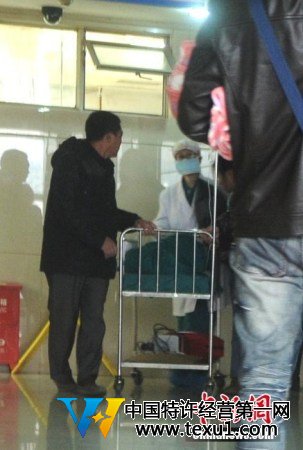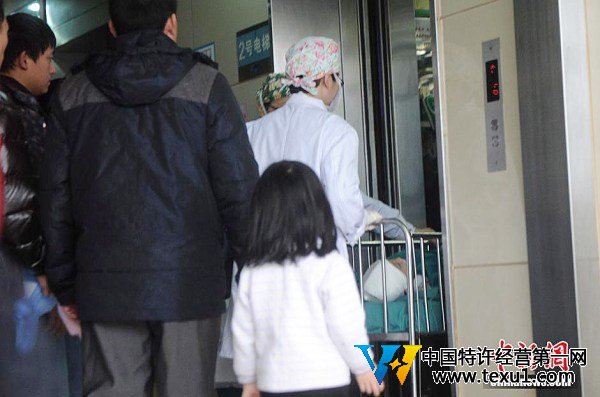 2013年12月16日上午8時許,重慶長壽區被摔男嬰原原在重慶醫科大學附屬兒童醫院進行開顱手術。圖為醫生將原原推進電梯。