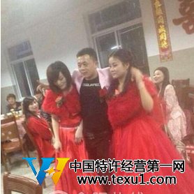 從照片看,新郎留著平頭,一左一右摟著兩個披著紅嫁衣的新娘,正給賓客敬酒。他們身后的墻壁上,貼著大紅的“喜”字和一副喜聯(lián)。